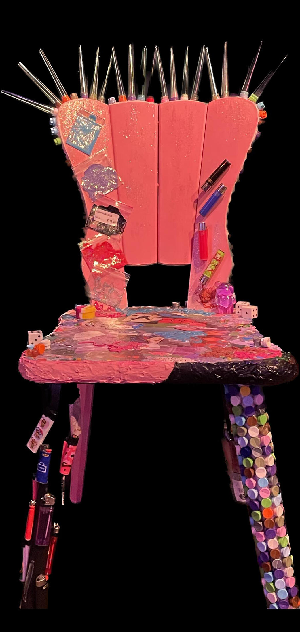chair sculpture. wood, plastic, lighters, joint holders, recycled materials etc