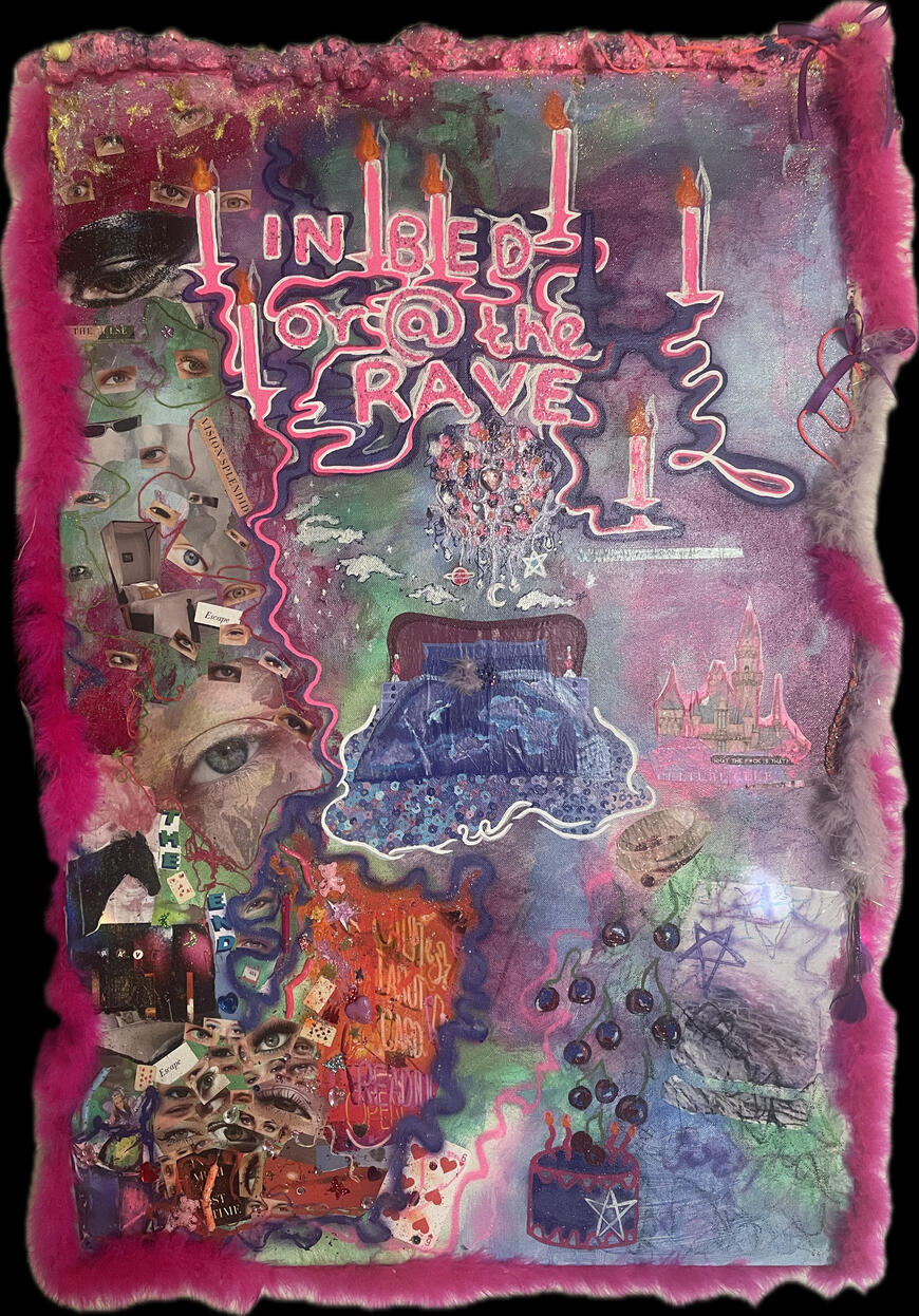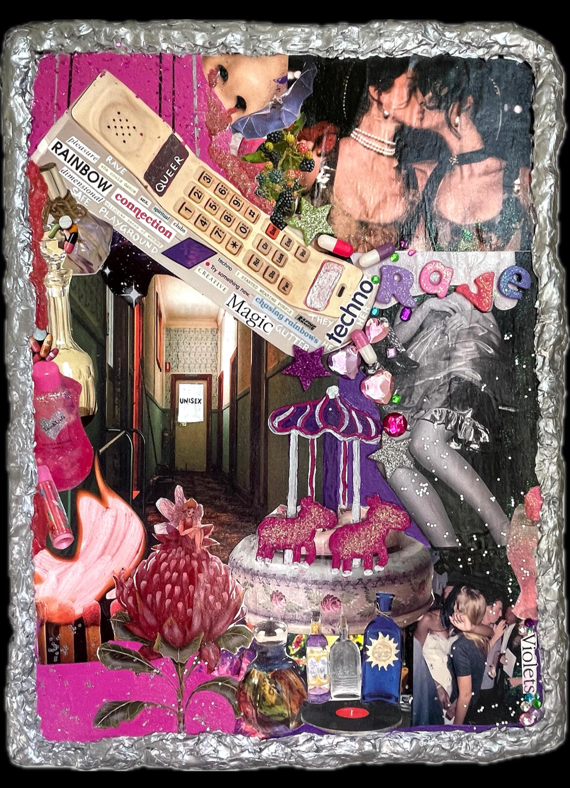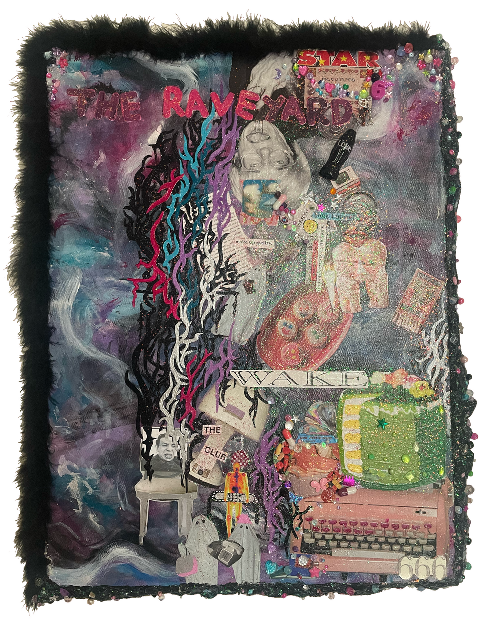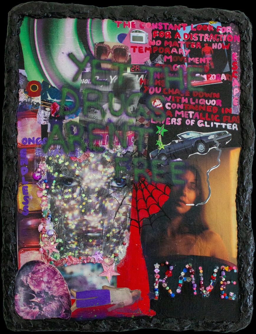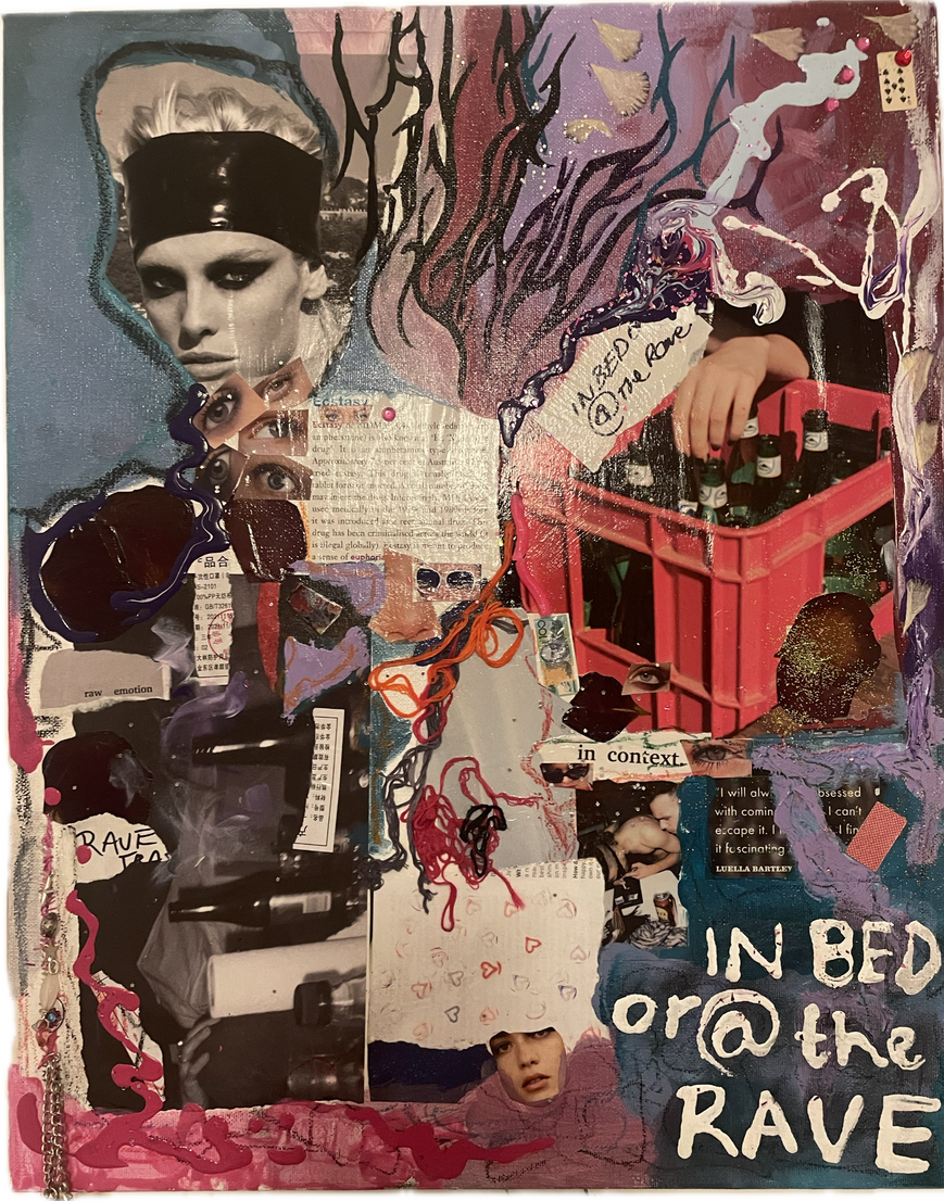 This erupts in a euphoric escape, capturing a community driven through connection. Abandoned buildings fuelled by illegal techno raves, open drug policies, and even more open dance floors. You could come as you are yet leave with an entirely new identity attached. A private space to feel the allure of connection, there’s a sense of ease and comfort here – a feeling you haven’t felt in some time. You surrender to it and let it in, allowing it to encapsulate you piece by piece. Oj's creations serve as a portal, offering viewers a unique journey into the playful, dark, and emotionally intricate realm of raves. Each encounter with her work is an intimate and multifaceted experience.OJ's work focuses on sustainability by utilizing pre-existing materials and repurposing them into unique art pieces. Incorporating old magazines, plastics, glass bottles, trinkets and other discarded items.