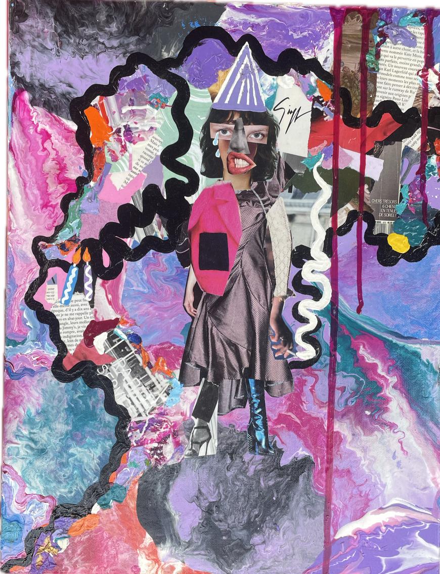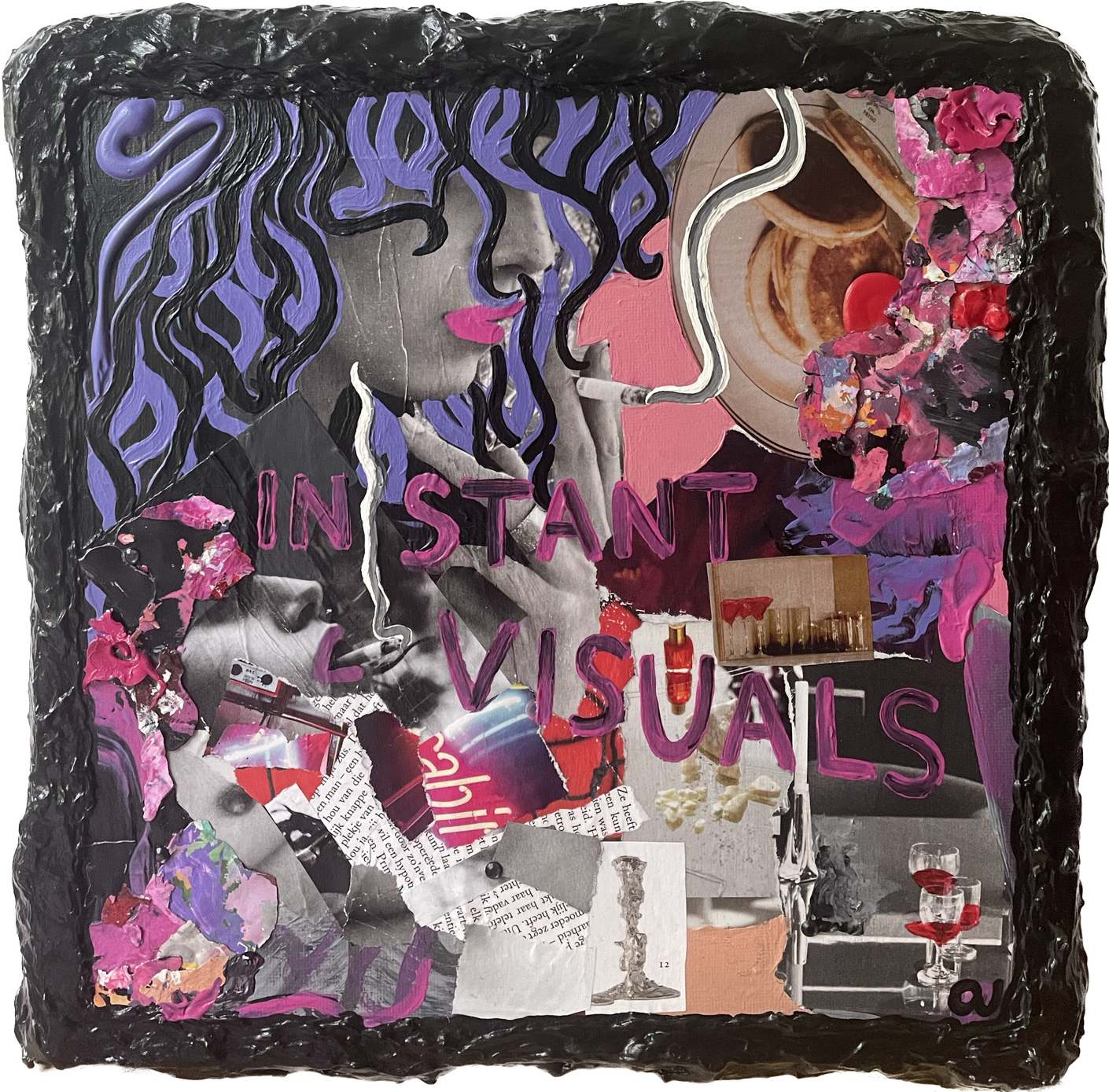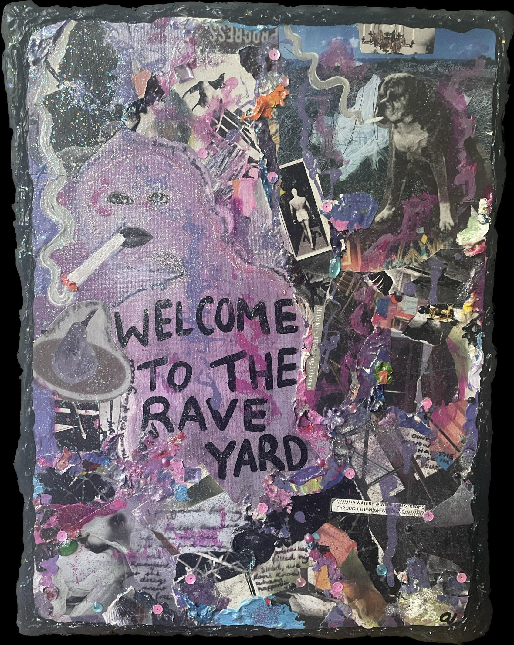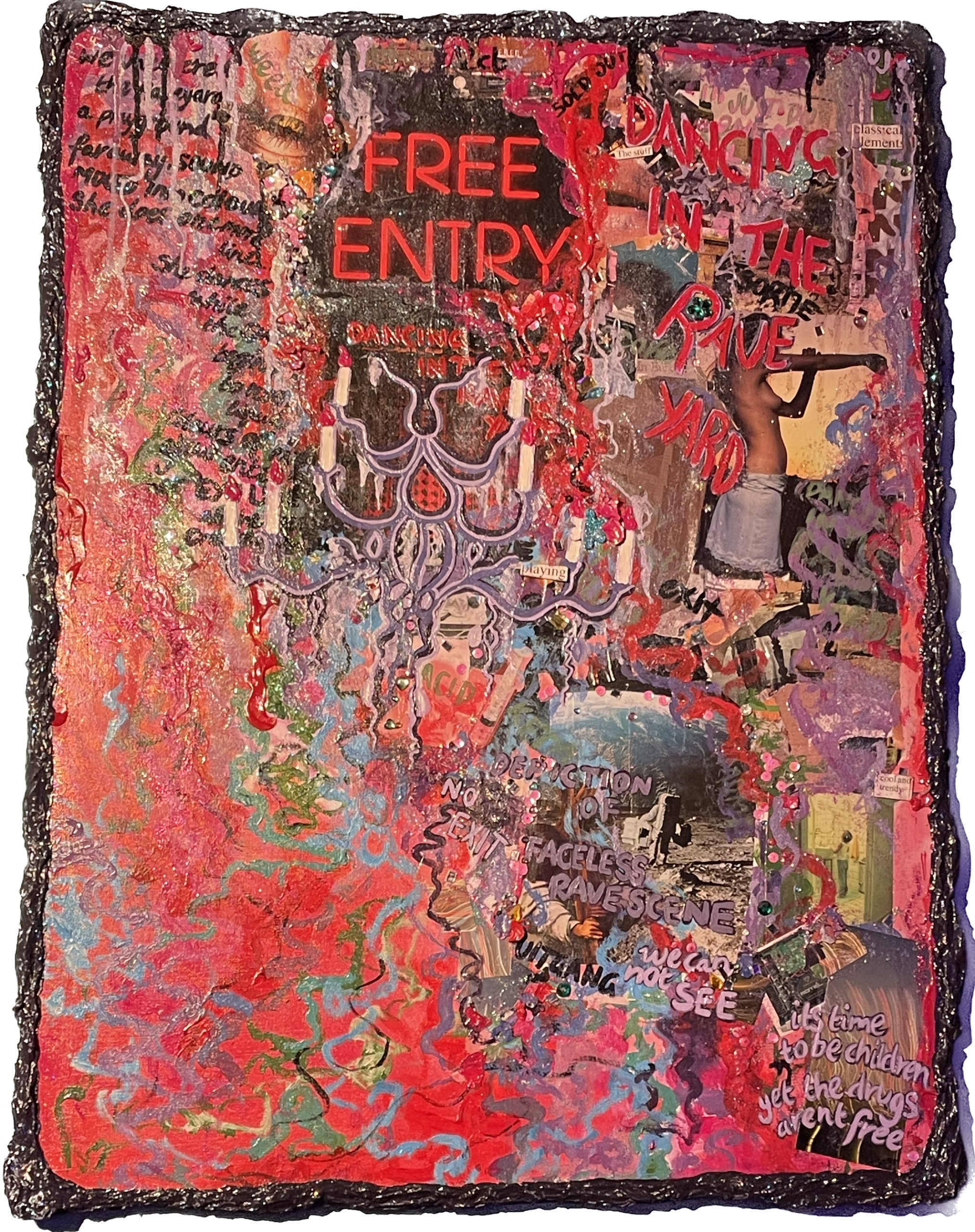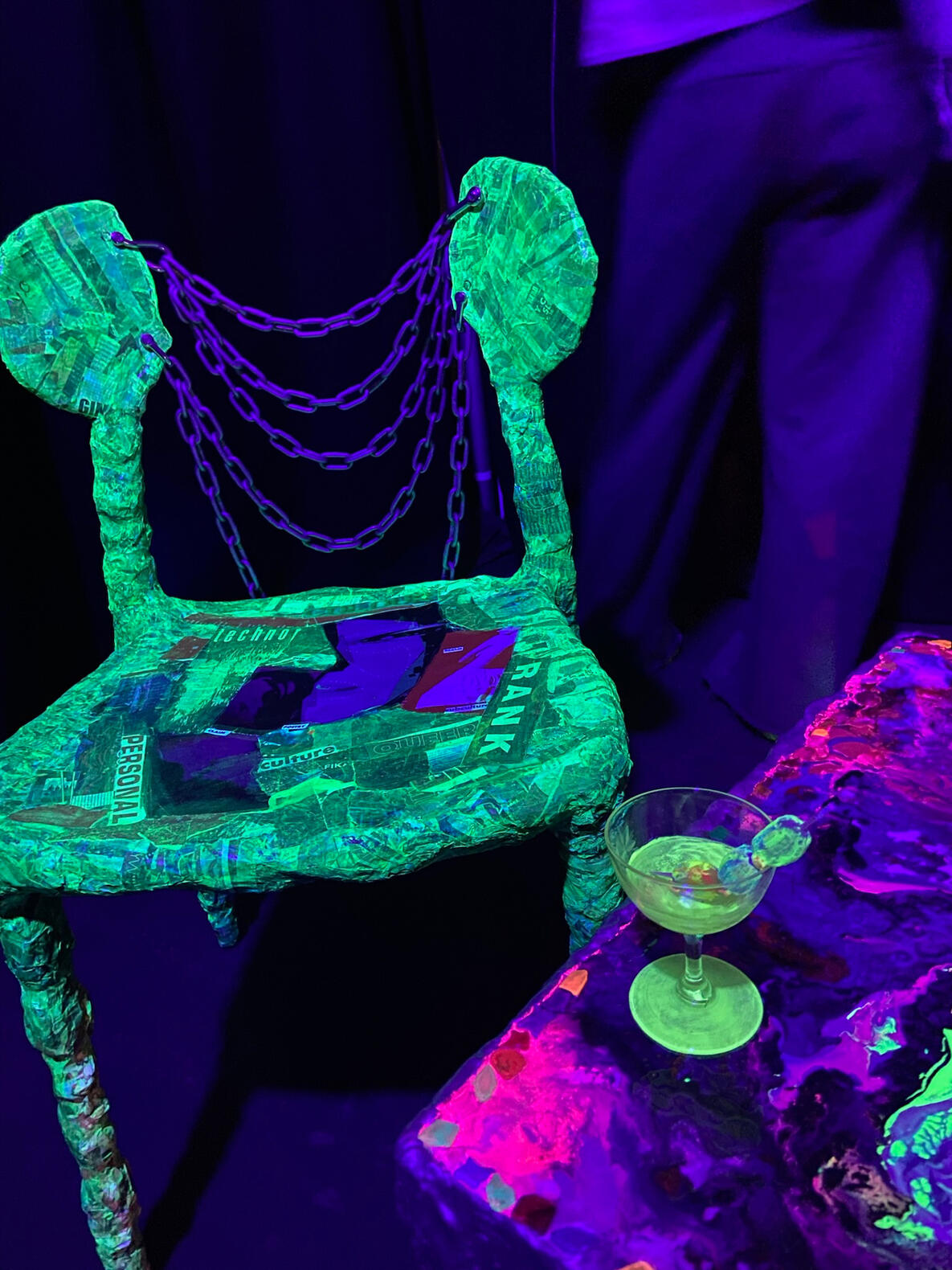 This erupts in a euphoric escape, capturing a community driven through connection. Abandoned buildings fuelled by illegal techno raves, open drug policies, and even more open dance floors. You could come as you are yet leave with an entirely new identity attached. A private space to feel the allure of connection, there’s a sense of ease and comfort here – a feeling you haven’t felt in some time. You surrender to it and let it in, allowing it to encapsulate you piece by piece. Oj's creations serve as a portal, offering viewers a unique journey into the playful, dark, and emotionally intricate realm of raves. Each encounter with her work is an intimate and multifaceted experience.OJ's work focuses on sustainability by utilizing pre-existing materials and repurposing them into unique art pieces. Incorporating old magazines, plastics, glass bottles, trinkets and other discarded items.