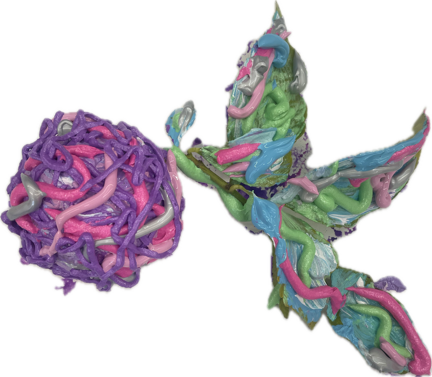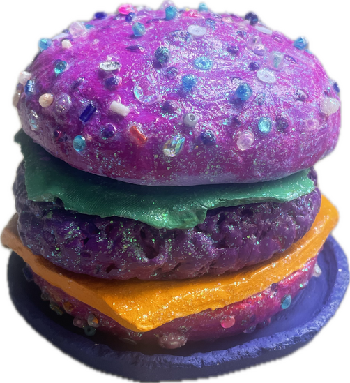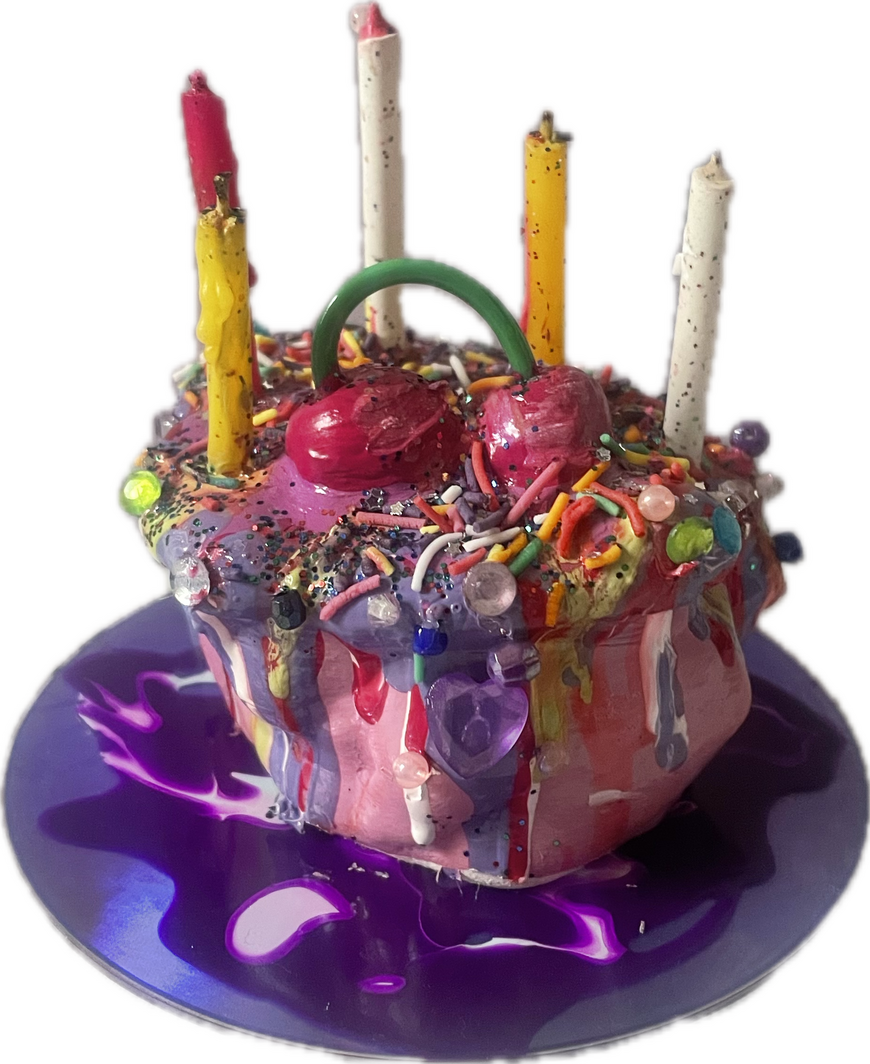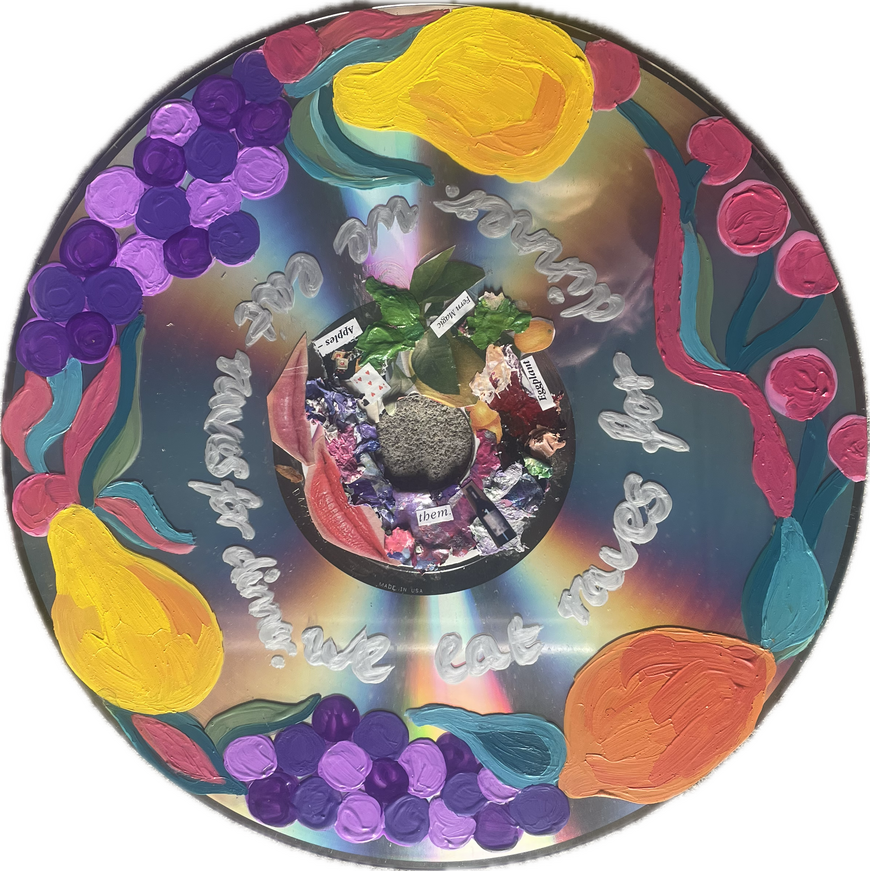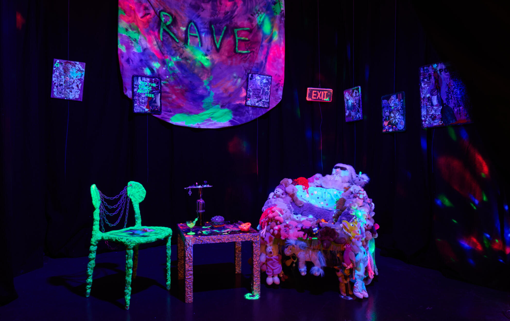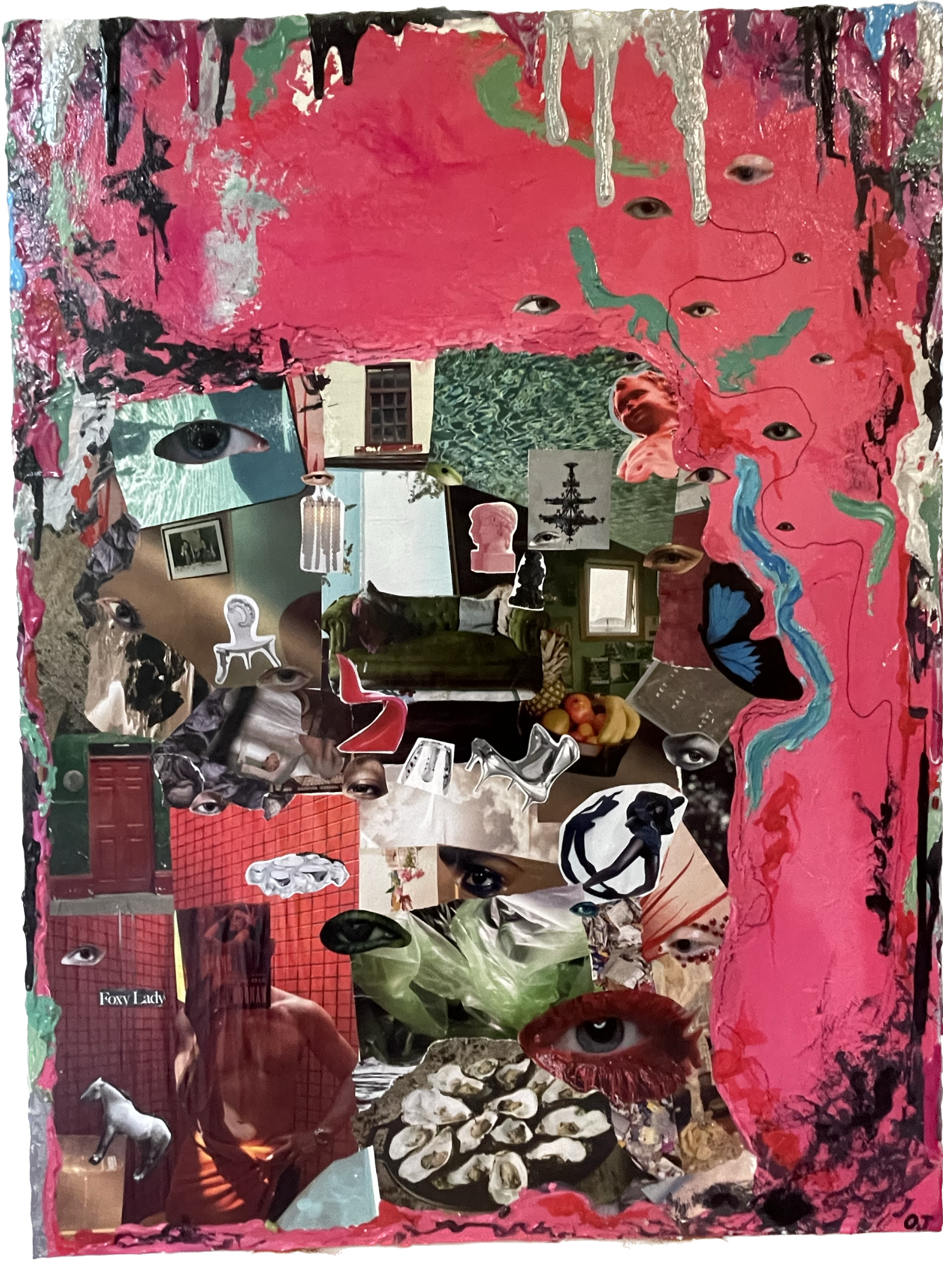 This erupts in a euphoric escape, capturing a community driven through connection. Abandoned buildings fuelled by illegal techno raves, open drug policies, and even more open dance floors. You could come as you are yet leave with an entirely new identity attached. A private space to feel the allure of connection, there’s a sense of ease and comfort here – a feeling you haven’t felt in some time. You surrender to it and let it in, allowing it to encapsulate you piece by piece. Oj's creations serve as a portal, offering viewers a unique journey into the playful, dark, and emotionally intricate realm of raves. Each encounter with her work is an intimate and multifaceted experience.OJ's work focuses on sustainability by utilizing pre-existing materials and repurposing them into unique art pieces. Incorporating old magazines, plastics, glass bottles, trinkets and other discarded items.