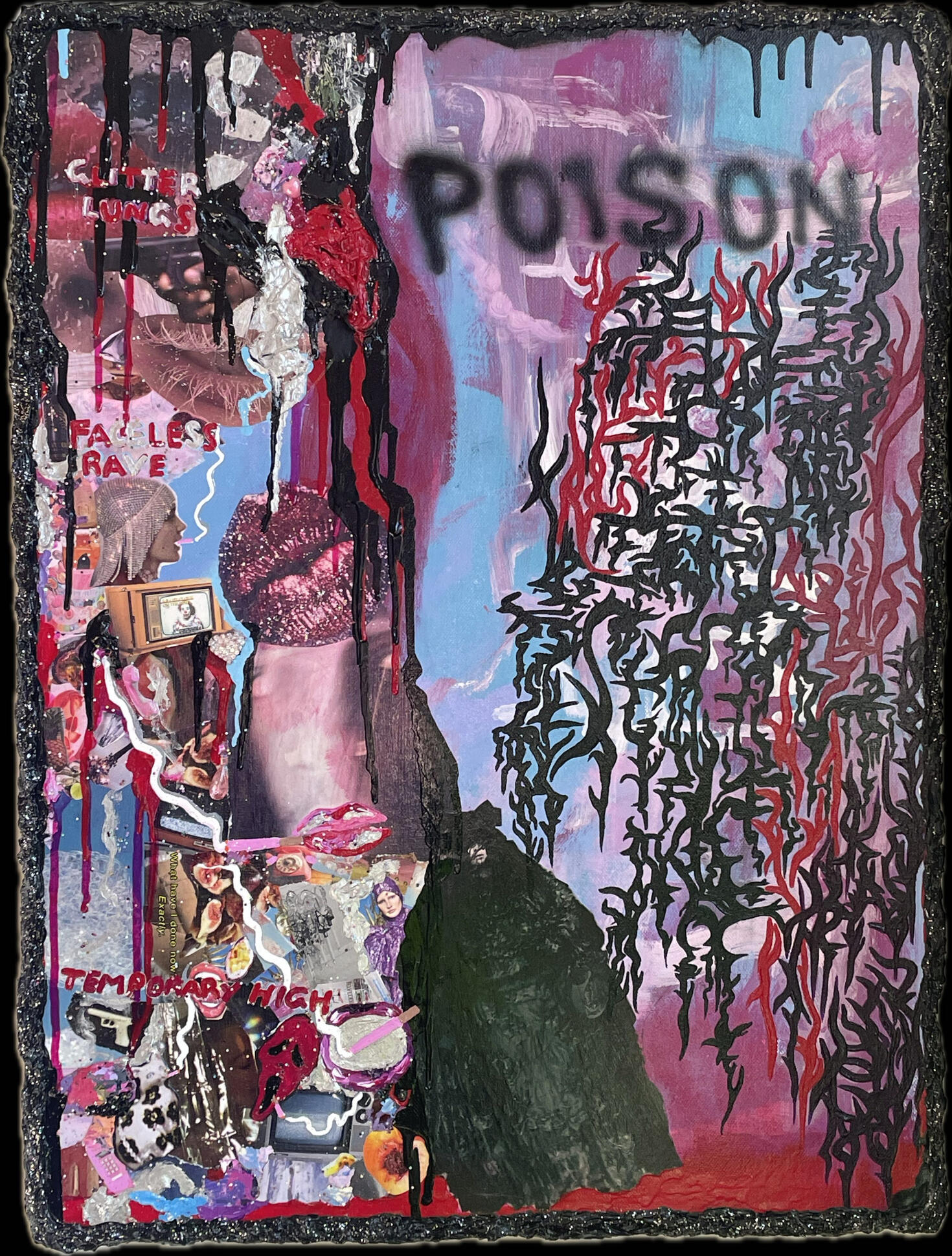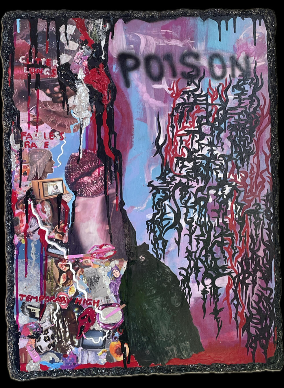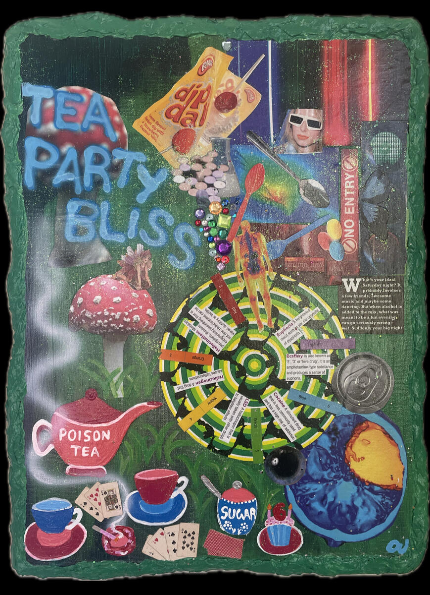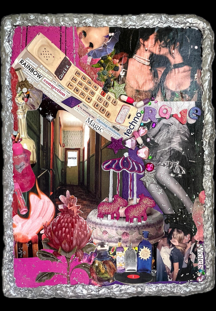 First conceptualised during her time in Paris, "Poison We Love" reflects Olivias long-standing fascination with the rave and drug culture. Presenting multimedia collage paintings imbued with poignant elements of poetry and childlike wonder. Playful sculptures along with immersive installations capturing the duality of euphoria and darkness often associated with raves and drug consumption, along with their associated physical effects. Her immersive and multi-faceted approach allows viewers to step into the world of raves and drugs, offering a profound exploration of their complexities and associated emotions.