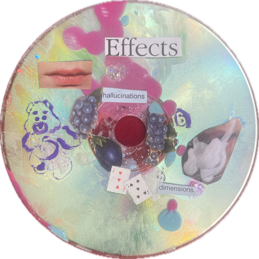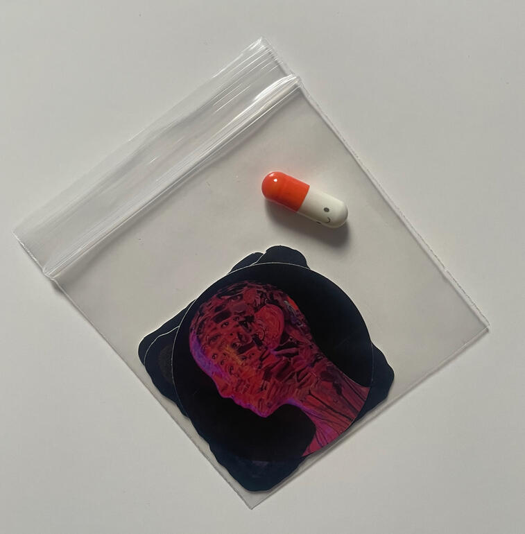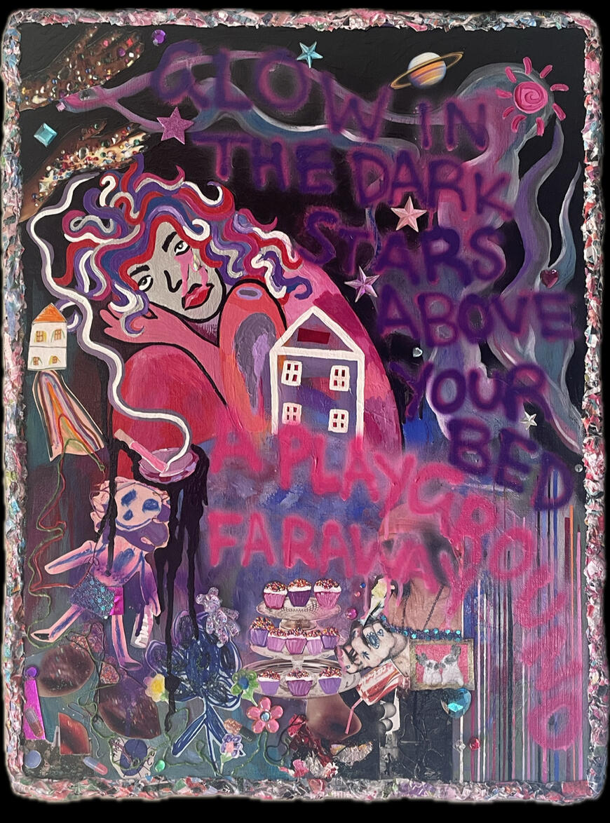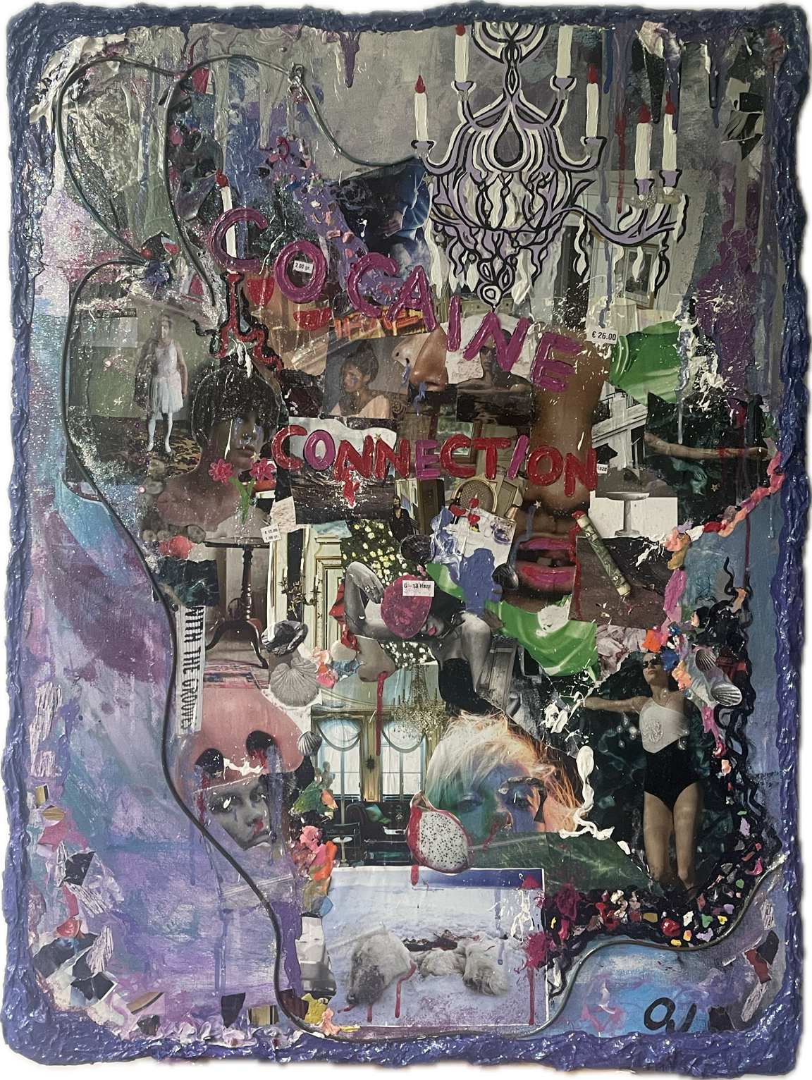First conceptualised during her time in Paris, "Poison We Love" reflects Olivias long-standing fascination with the rave and drug culture. Presenting multimedia collage paintings imbued with poignant elements of poetry and childlike wonder. Playful sculptures along with immersive installations capturing the duality of euphoria and darkness often associated with raves and drug consumption, along with their associated physical effects. Her immersive and multi-faceted approach allows viewers to step into the world of raves and drugs, offering a profound exploration of their complexities and associated emotions.