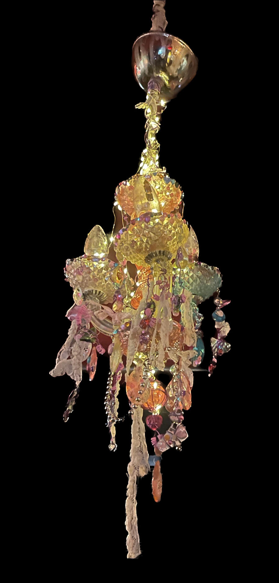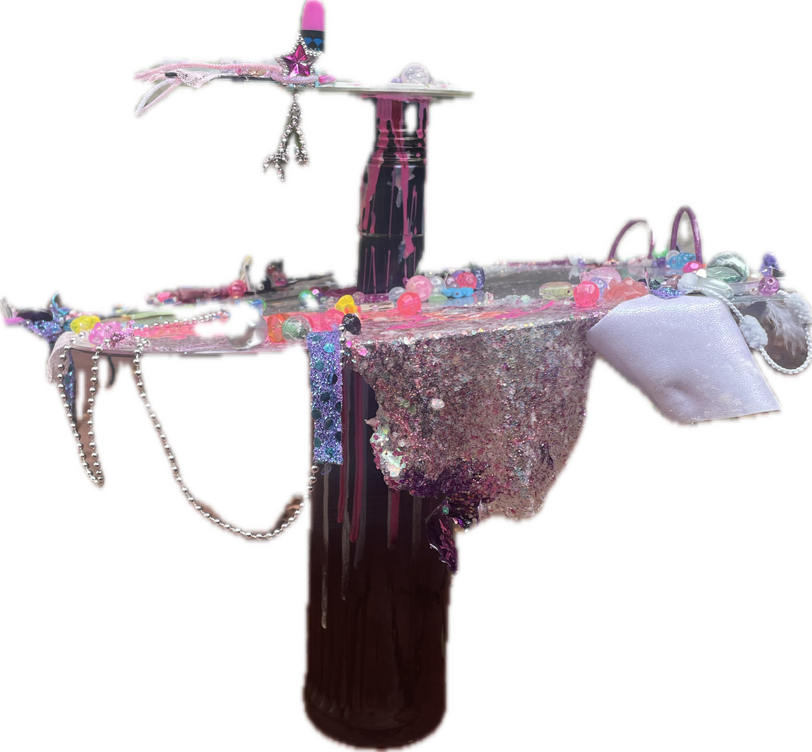 mixed media sculpture with collage, spray paint, gems, mirror pieces