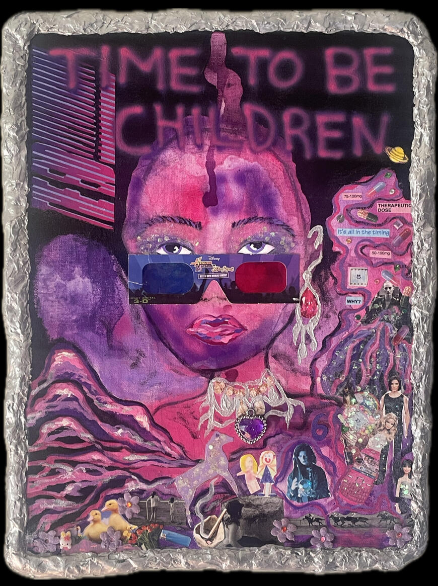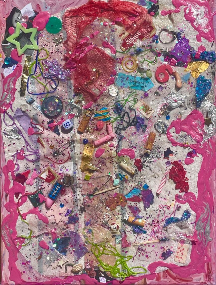mixed media, collage, gems, glitter, plastic pills, foam letters on canvas framed with recycled materials