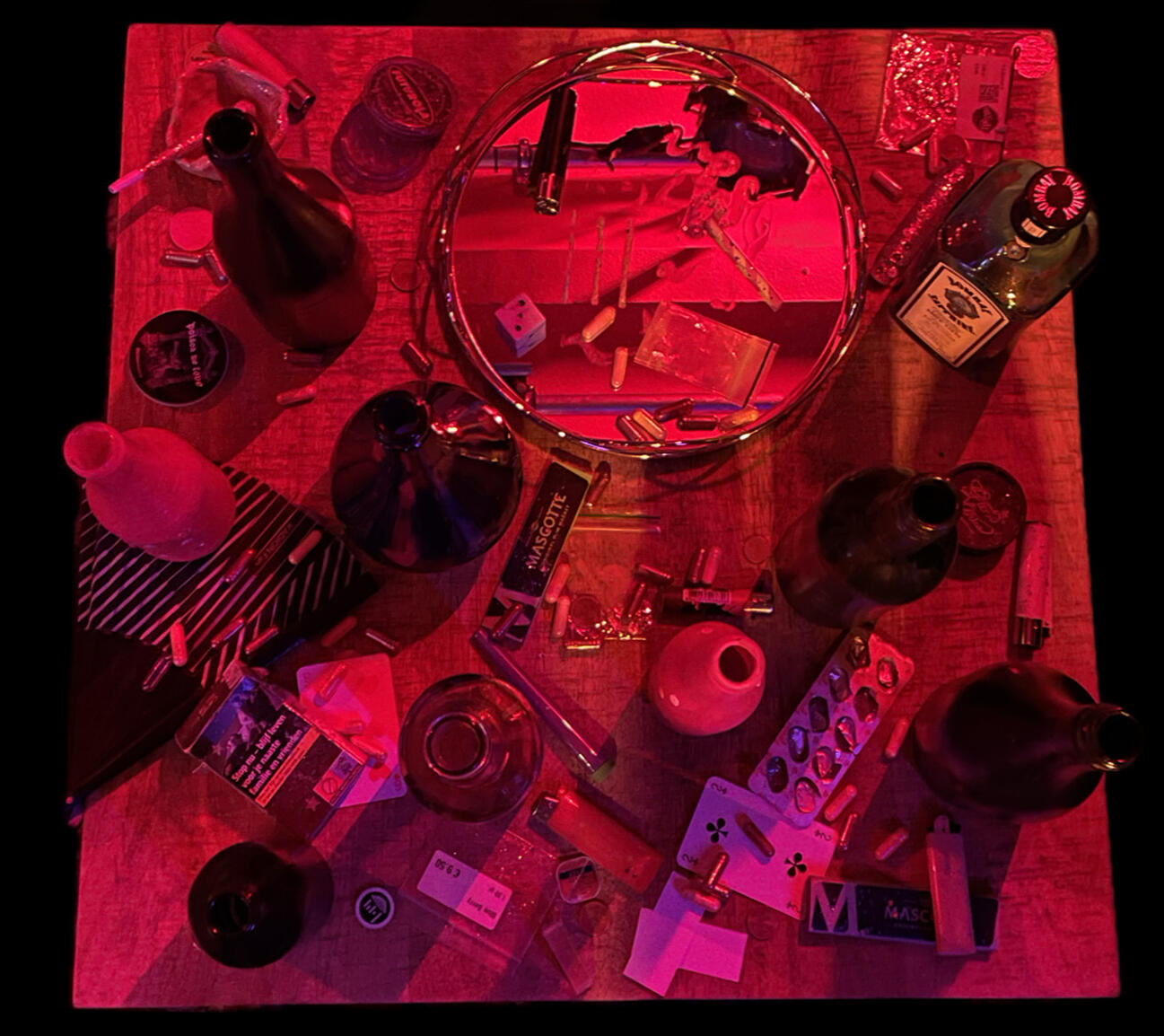Installation with mixed materials including glass bottles, glitter filled pills, lighters ashtrays, lines of glitter, rave fan ect.