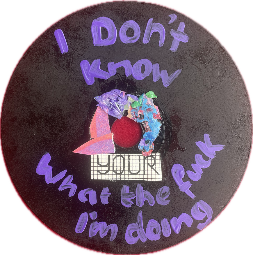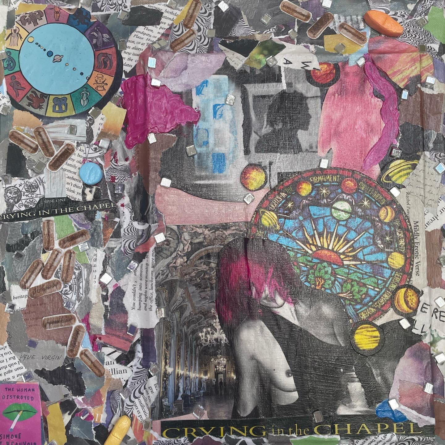 acrylic, clay, mirror pieces, collage, recycled record covers & mixed media on canvas with glossy finish.