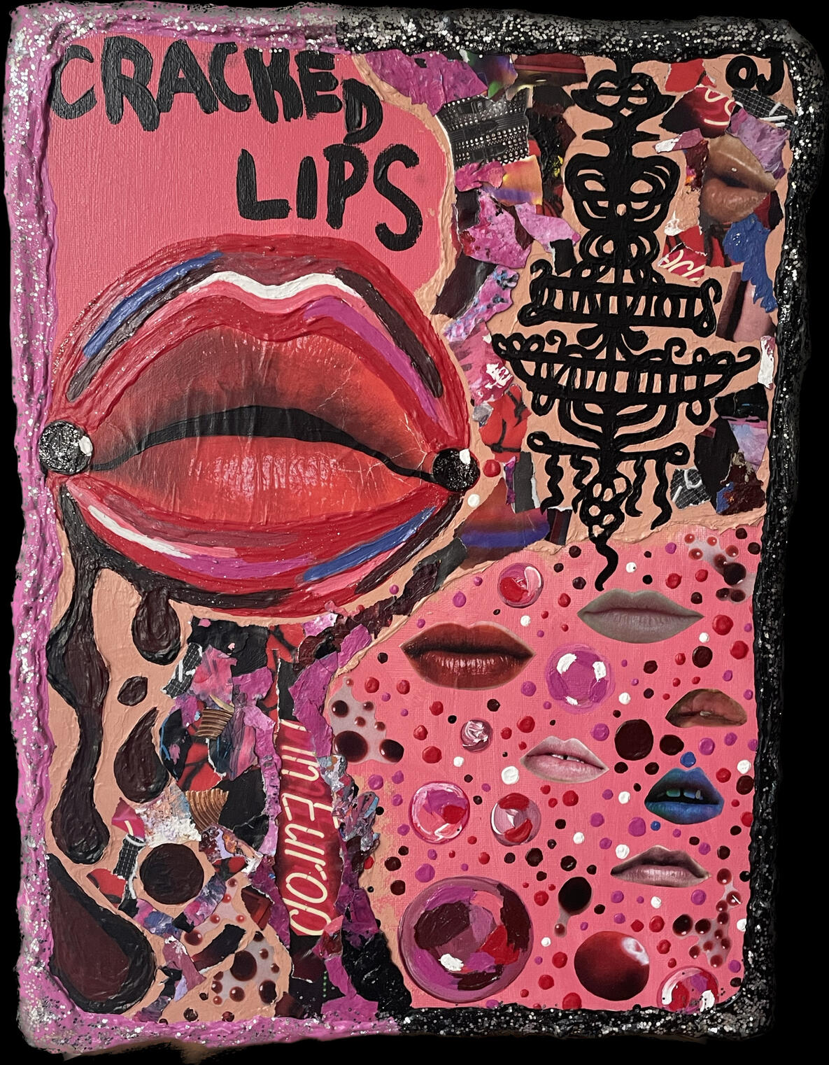 Acrylic, gems, glitter, collage & mixed media framed with gesso & recycled materials with glitter gloss finish