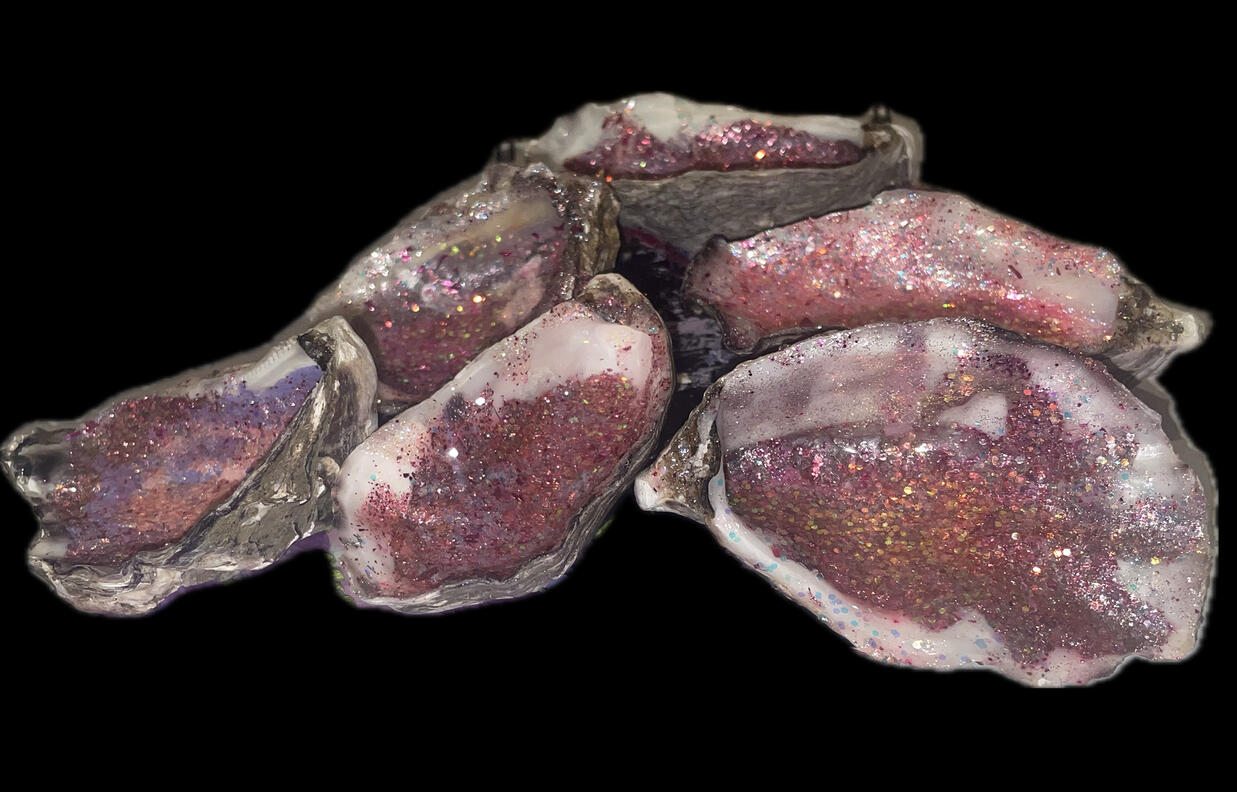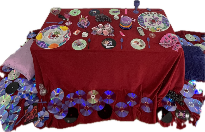 1.We eat raves for dinner, 2025, mixed media installation including glitter-filled oysters, martini glasses, foam olives, teacups, glitter pills, fake fruits, glitter, gems, fragmented discs, trinkets, lipsticks, rave glasses, Miniature spoons.