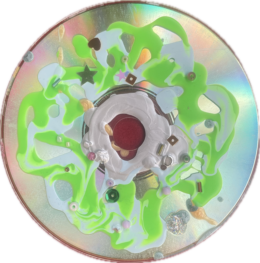 sculpture of fragmented recycled laser discs, glass bottles, melted nail polish colours, gems, and trinkets fused together